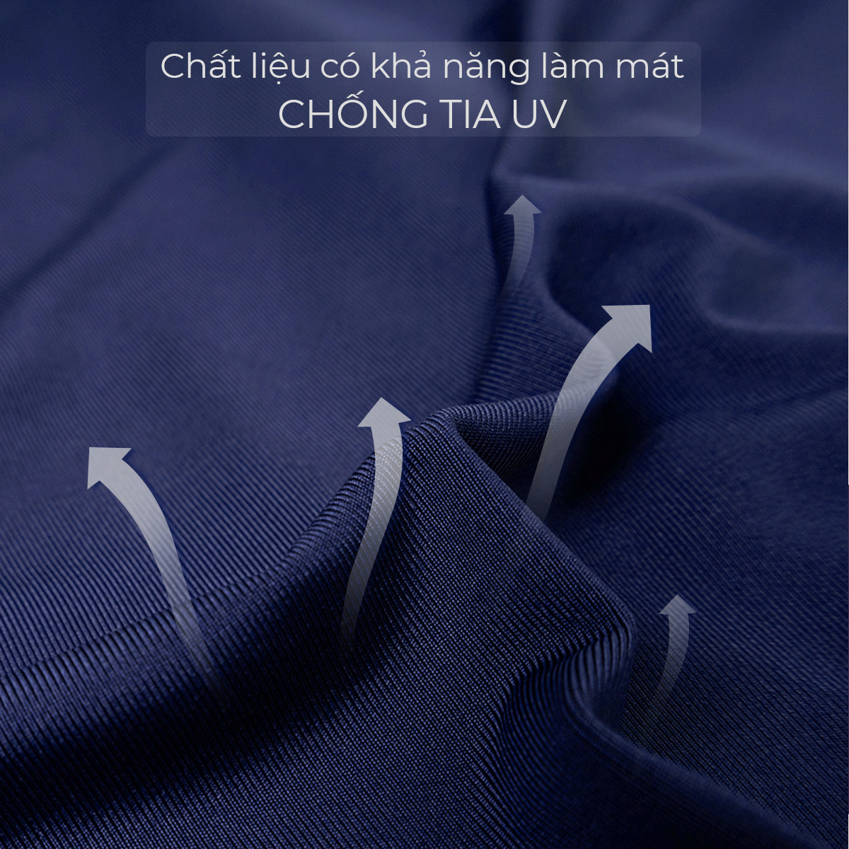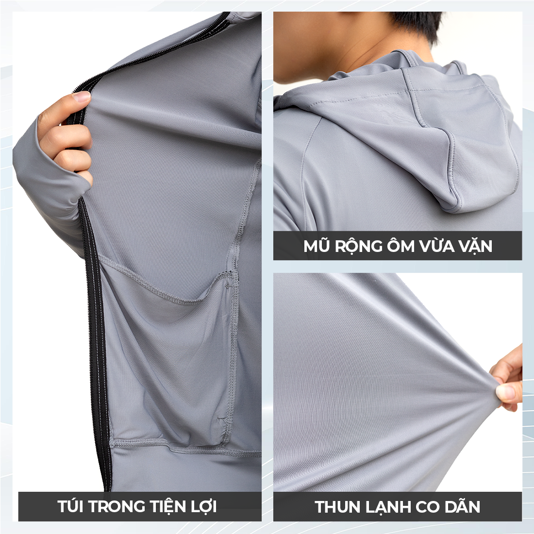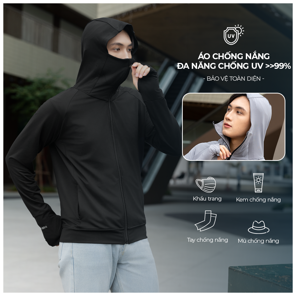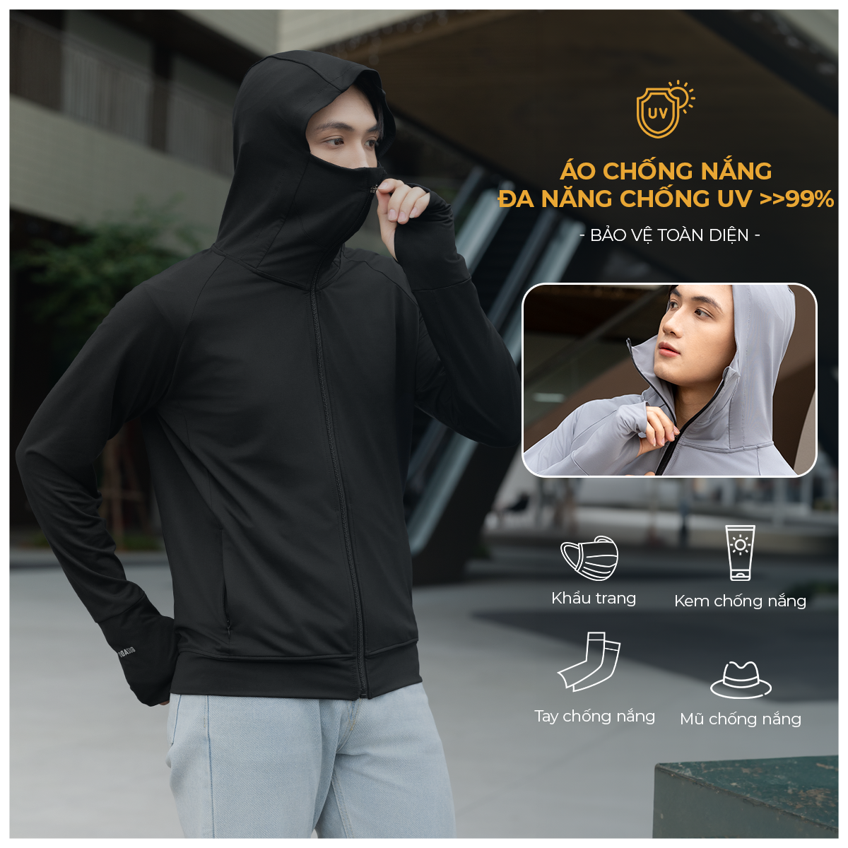 Thiết kế ống tay dài, mũ trùm, cổ kéo cao đến mũi đảm bảo che chắn hoàn toàn dưới ánh nắng mặt trời