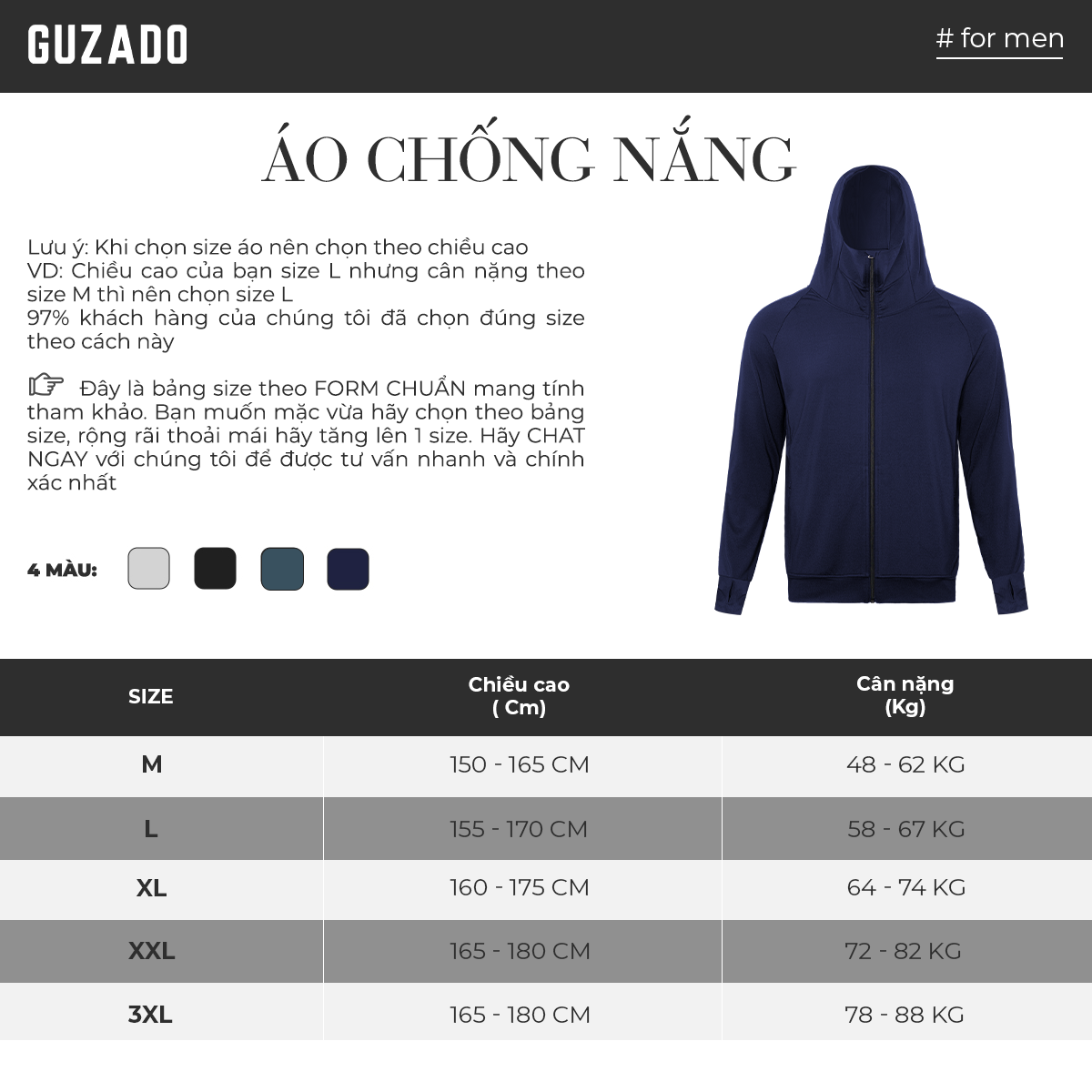 Áo chống nắng là item không thể thiếu mỗi khi đi ra đường của người Việt Nam vào những ngày Hè nóng gắt. Không chỉ phái nữ mà cánh mày râu cũng cần bảo vệ làn da của mình trước tác hại của tia UV. Áo chống nắng Guzado đáp ứng đủ các yêu cầu chống tia UV làm mát là sự lựa chọn hoàn hảo cho anh em và mùa hè năm nay.