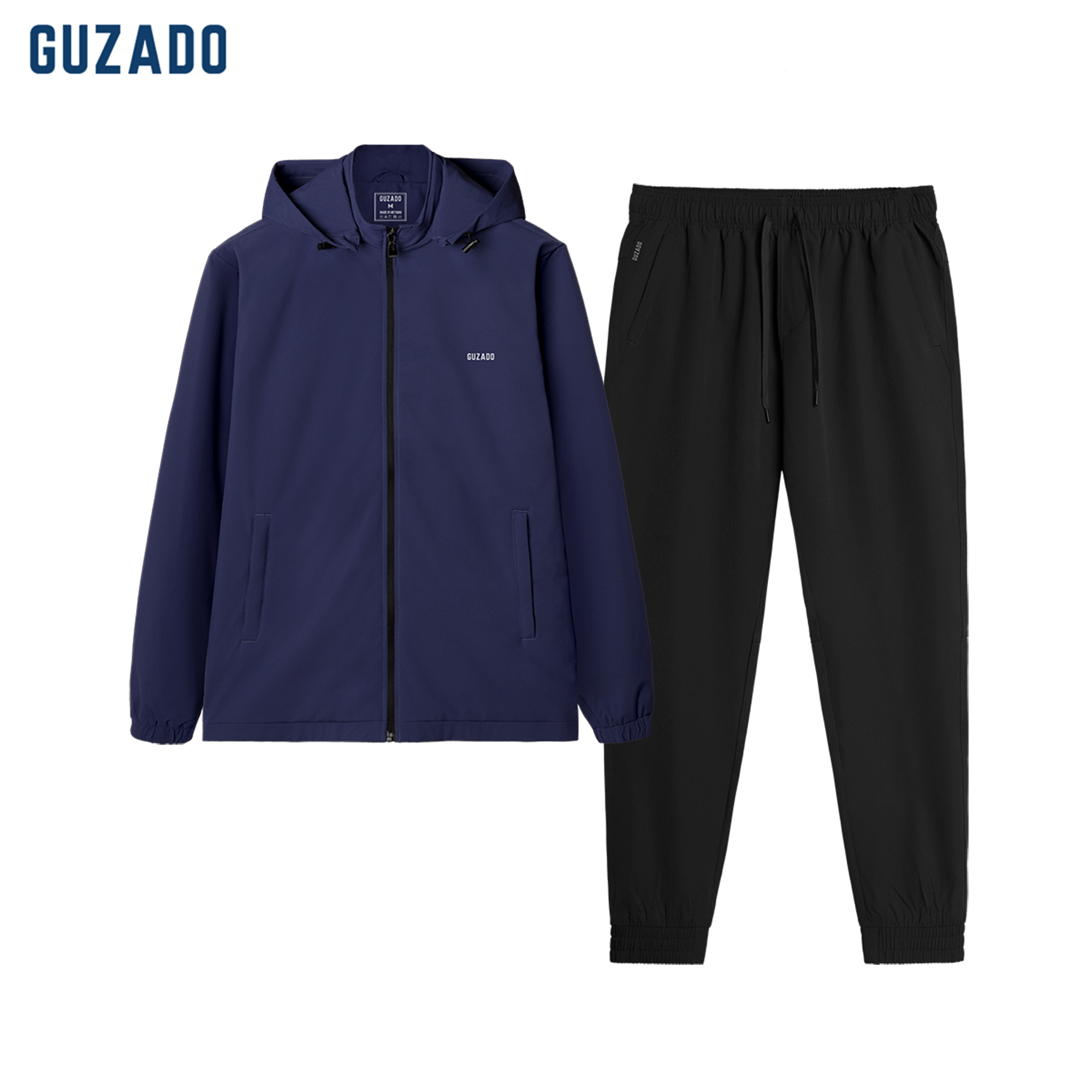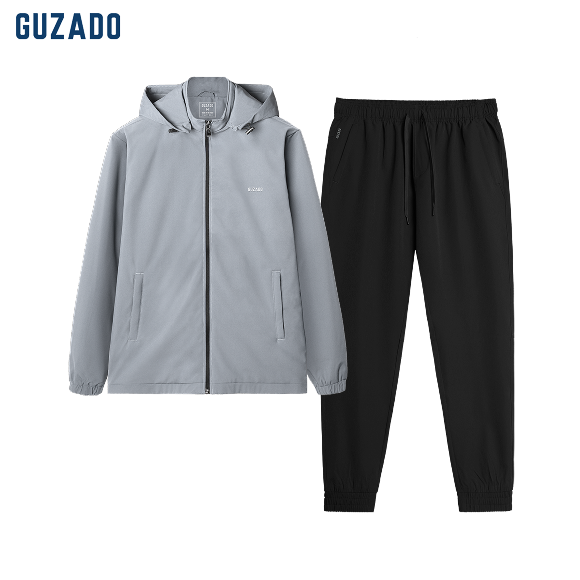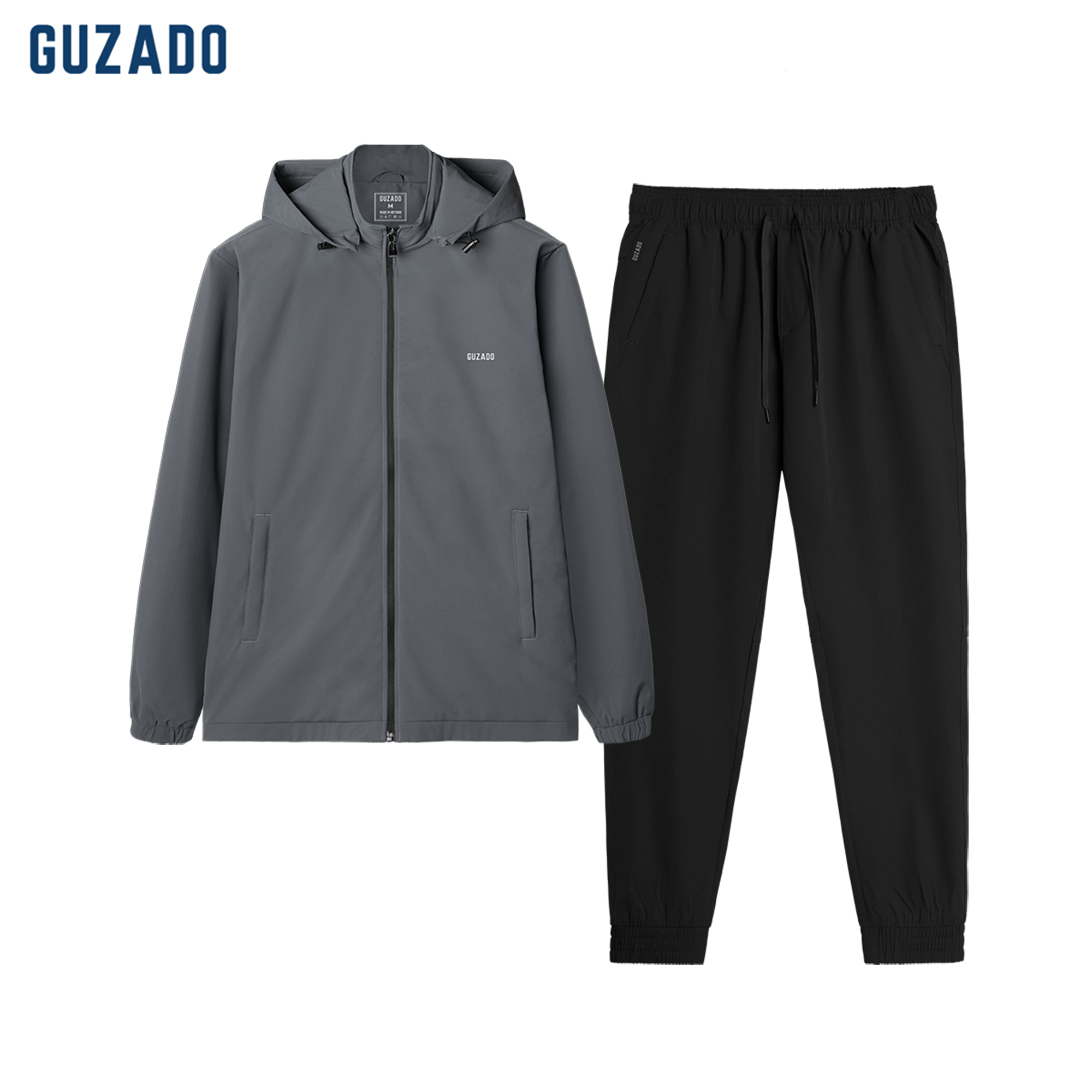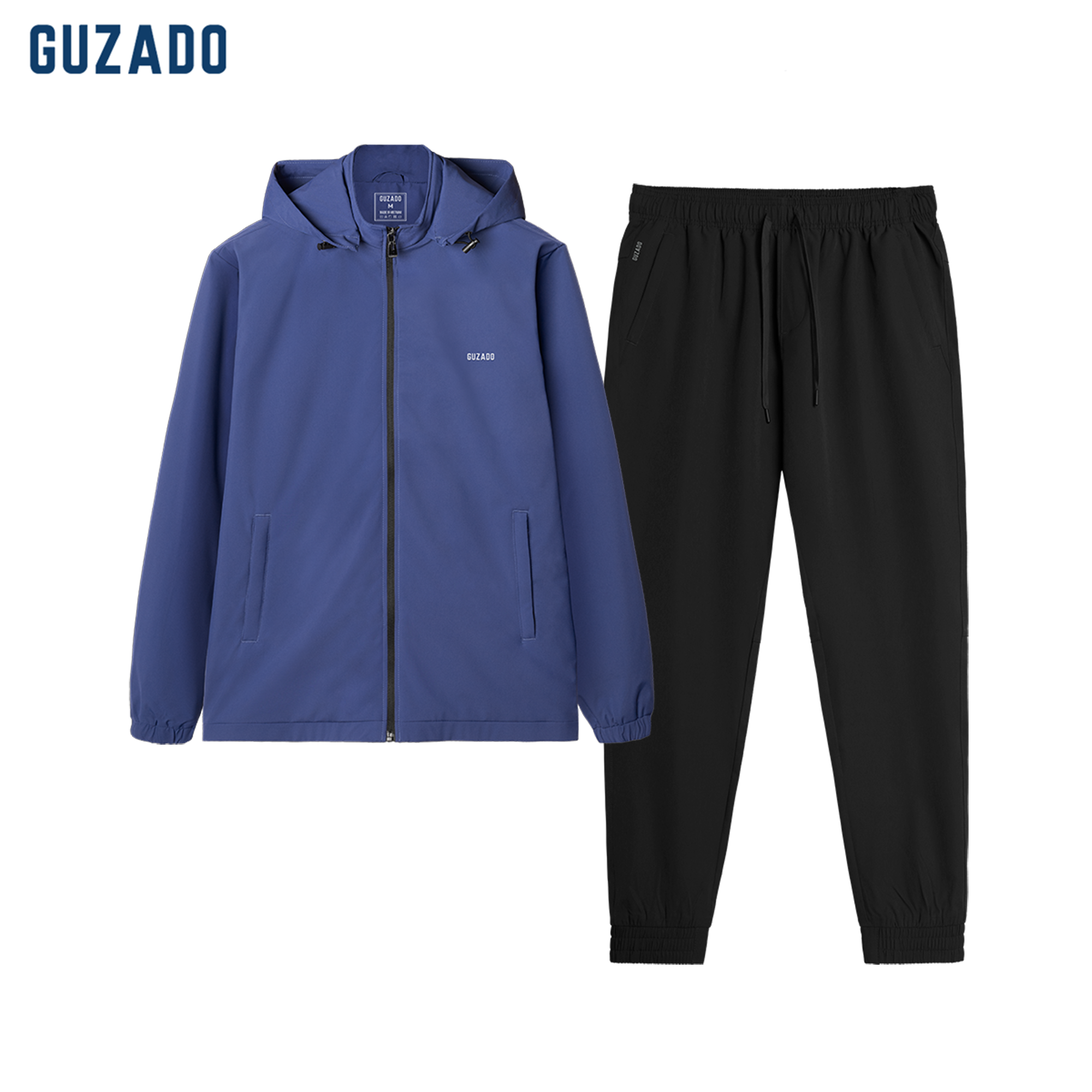 Bộ gió nam GUZADO gồm áo khoác và quần dài, chất liệu nhẹ, mềm mại. Áo dày dặn, chắn gió tốt, có mũ tháo rời và túi khóa kéo. Quần JOGGER mềm mịn, thoải mái, phù hợp phong cách thể thao, trẻ trung và năng động.